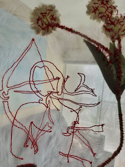 Um corpo se delineia em linha vermelha: arqueiro em tensão, mártir atravessado, caçador e ferido. São Sebastião e Oxóssi se encontram no mesmo gesto — a flecha que fere e a flecha que protege transformadas em agulha, costura e cicatriz. O tecido é pele exposta, atravessada por fios que sangram e ao mesmo tempo sustentam; zonas de sutura guardam memórias e feridas, lembranças inscritas nos corpos dissidentes. Suspensa, a obra habita o intervalo entre a ausência e o rito. Pende como vestimenta à espera de um corpo que já não está, ou que se esconde nas dobras do ar. O gesto de suspensão é também oferenda — aquilo que não repousa, mas se oferece em silêncio, como se o espaço ainda respirasse a presença de quem o habitou. Bordar torna-se liturgia: o ponto é reza, o fio é flecha, o nó é cicatriz. Cada gesto repete o esforço da permanência, o milagre da sobrevivência. O erotismo, aqui, não é adorno nem confissão — é força crua que se borda em ferida, devolvendo ao olhar a potência de um corpo que resiste, mesmo vulnerável, mesmo atravessado. Esses são corpos litúrgicos — corpos que fazem da vulnerabilidade um gesto de fé, da ausência uma forma de presença, da ferida um lugar de passagem. Corpos que, ao serem suspensos, continuam a rezar em silêncio.
