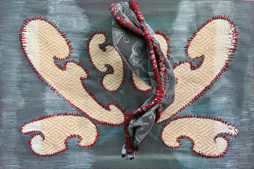 Entre o véu que encobre e a superfície que revela, a forma ornamentada se insinua — não como adorno, mas como vestígio de um corpo que se dobra. A linha vermelha, costurada em torno das curvas, não apenas contorna: sangra. É memória em ponto firme, cicatriz que marca o gesto de interromper a repetição e abrir espaço para o desvio. No centro, um nó: dobra de silêncio, boca cerrada, tensão que transforma a simetria em pergunta. O ornamento deixa de ser padrão e se torna território de passagem, lugar onde a matéria retém algo que não quer ser esquecido. Há uma presença que vibra sob o tecido, como um murmúrio preso entre trama e torção.